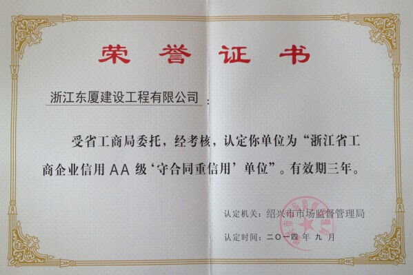 祝賀公司獲浙江省工商企業(yè)信用AA級‘守合同重信用’單位經(jīng)我公司申請,紹興市市場監(jiān)督管理局考核認定,我單位榮獲浙江省工商企業(yè)信用AA級‘守合同重信用’單位。