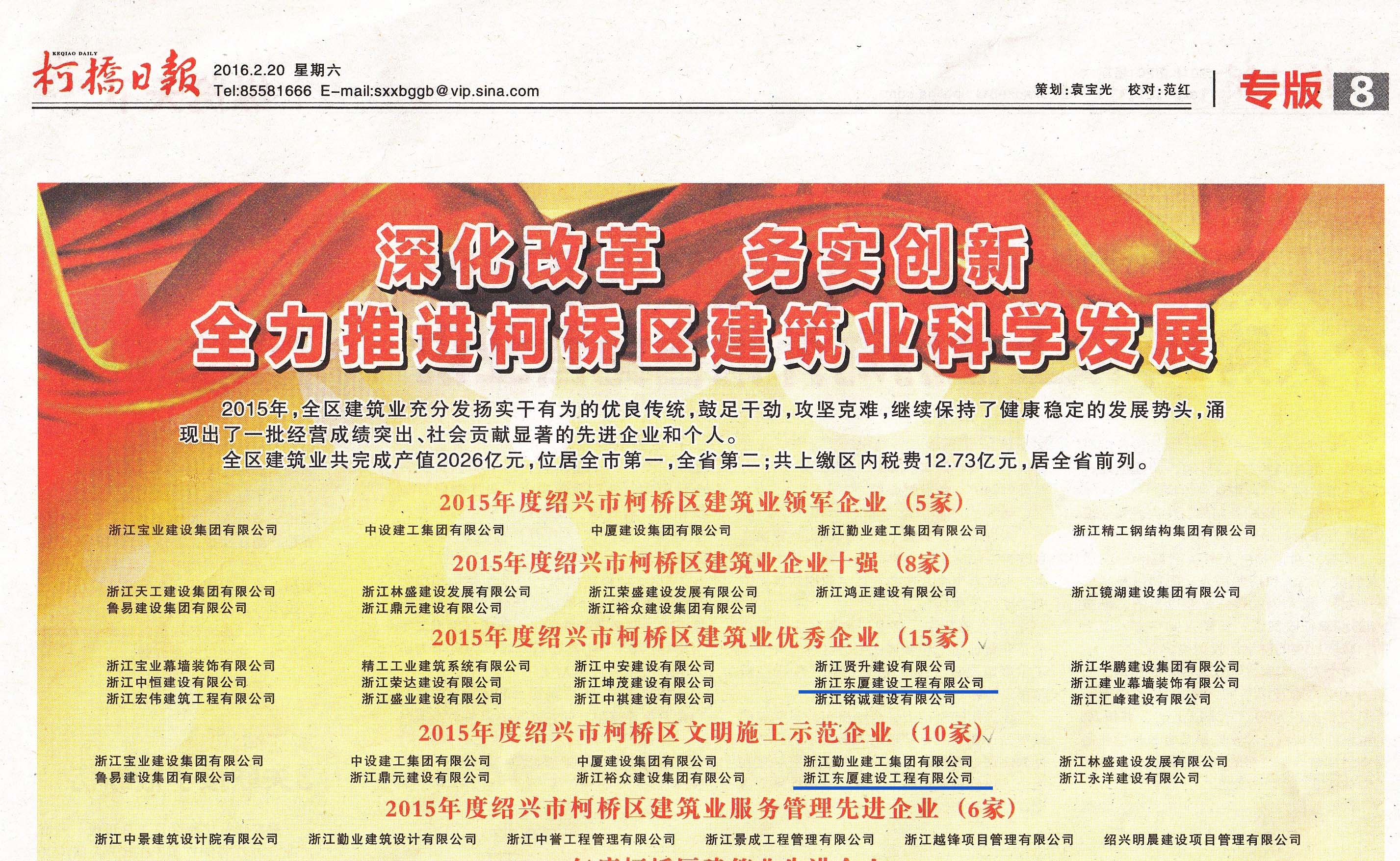 公司榮獲“2015年度紹興市柯橋區(qū)建筑業(yè)優(yōu)秀企業(yè)”和“紹興市柯橋區(qū)文明施工示范企業(yè)” |