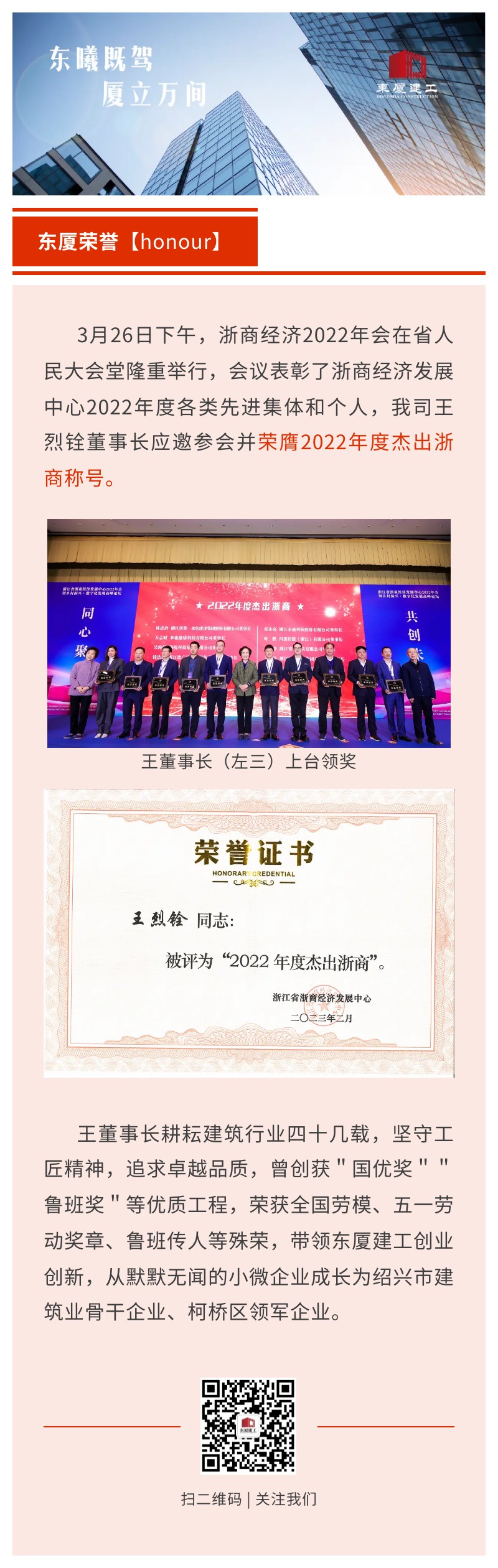 【東廈榮譽】王烈銓董事長榮膺2022年度杰出浙商稱號